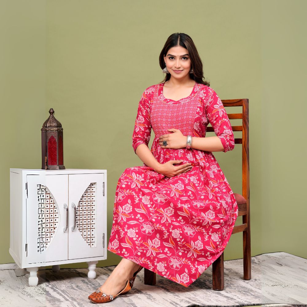 Ethnic Motifs Printed Maternity Cotton Fit and Flare Midi Dress