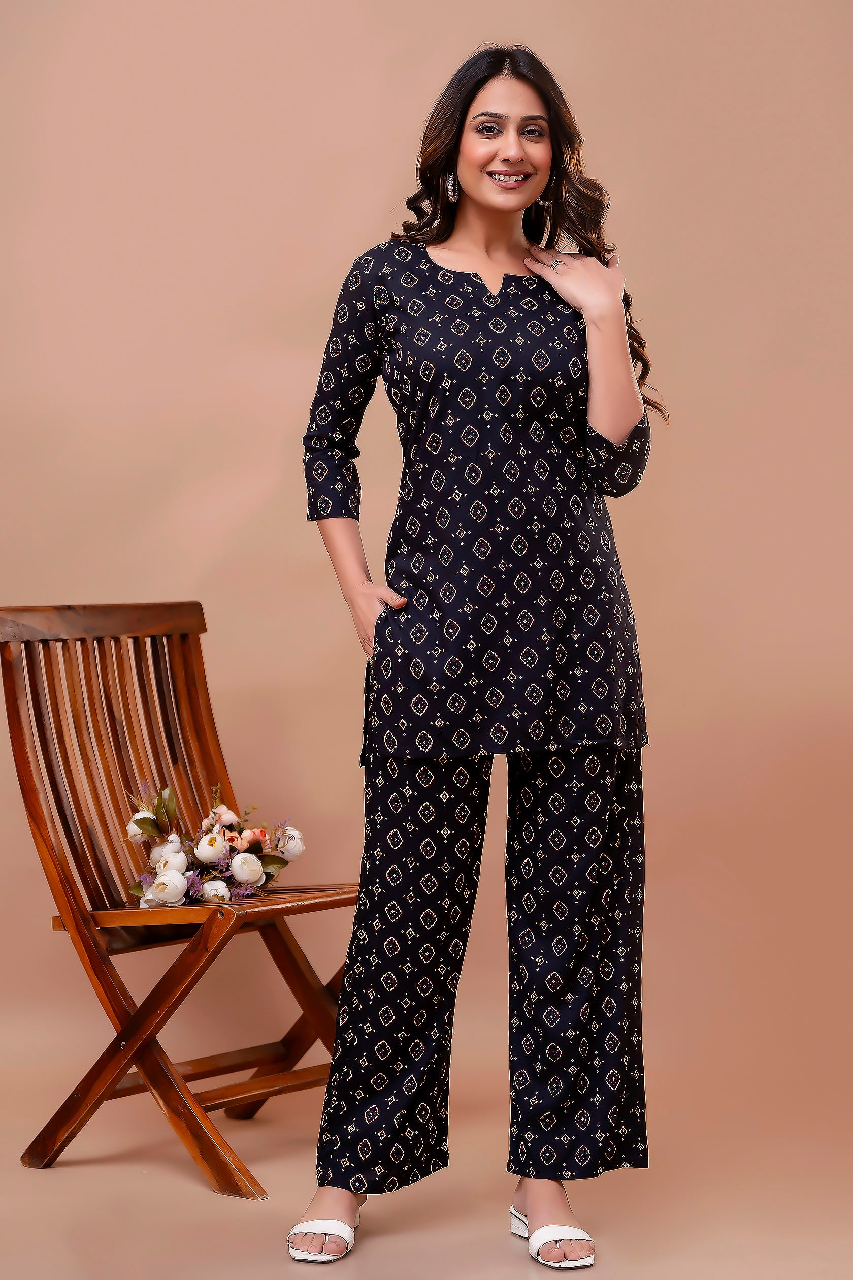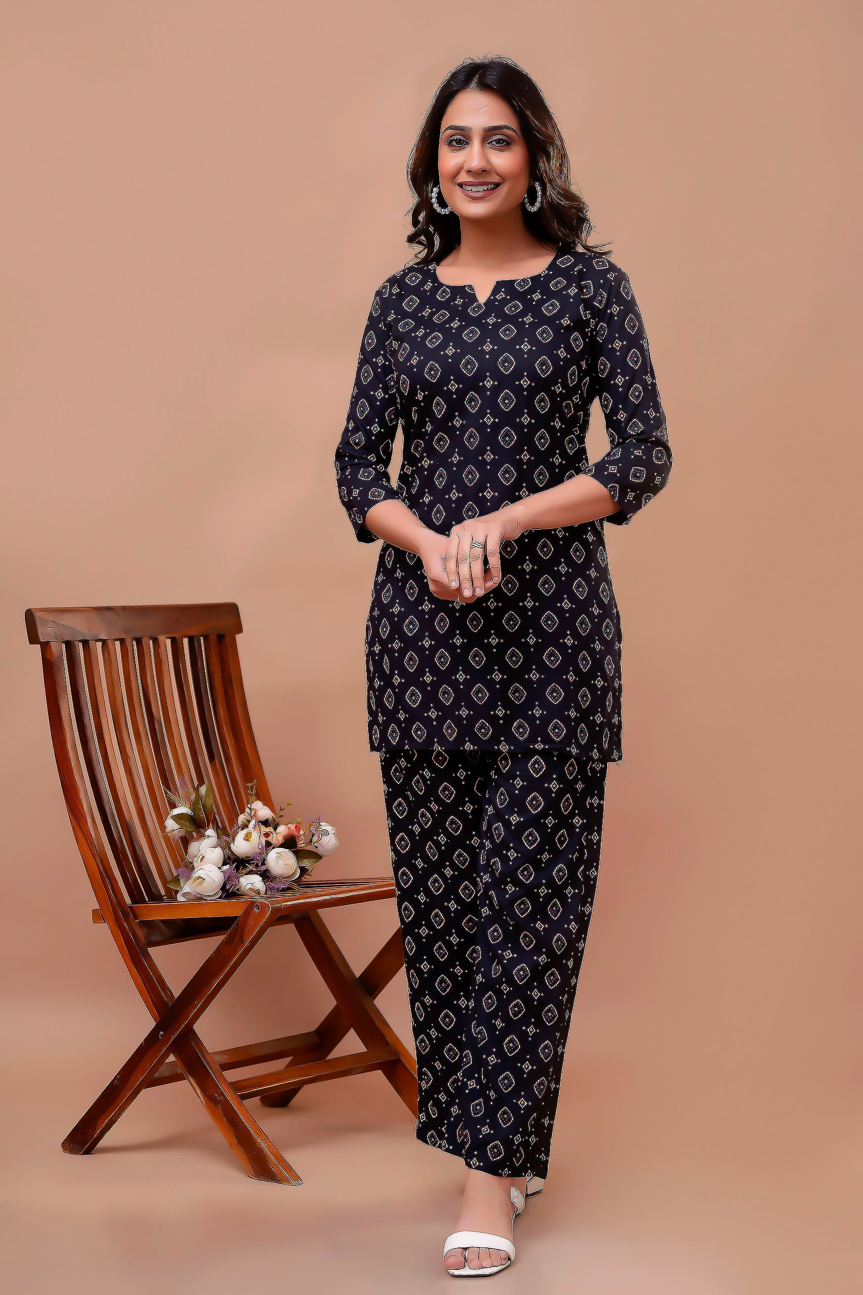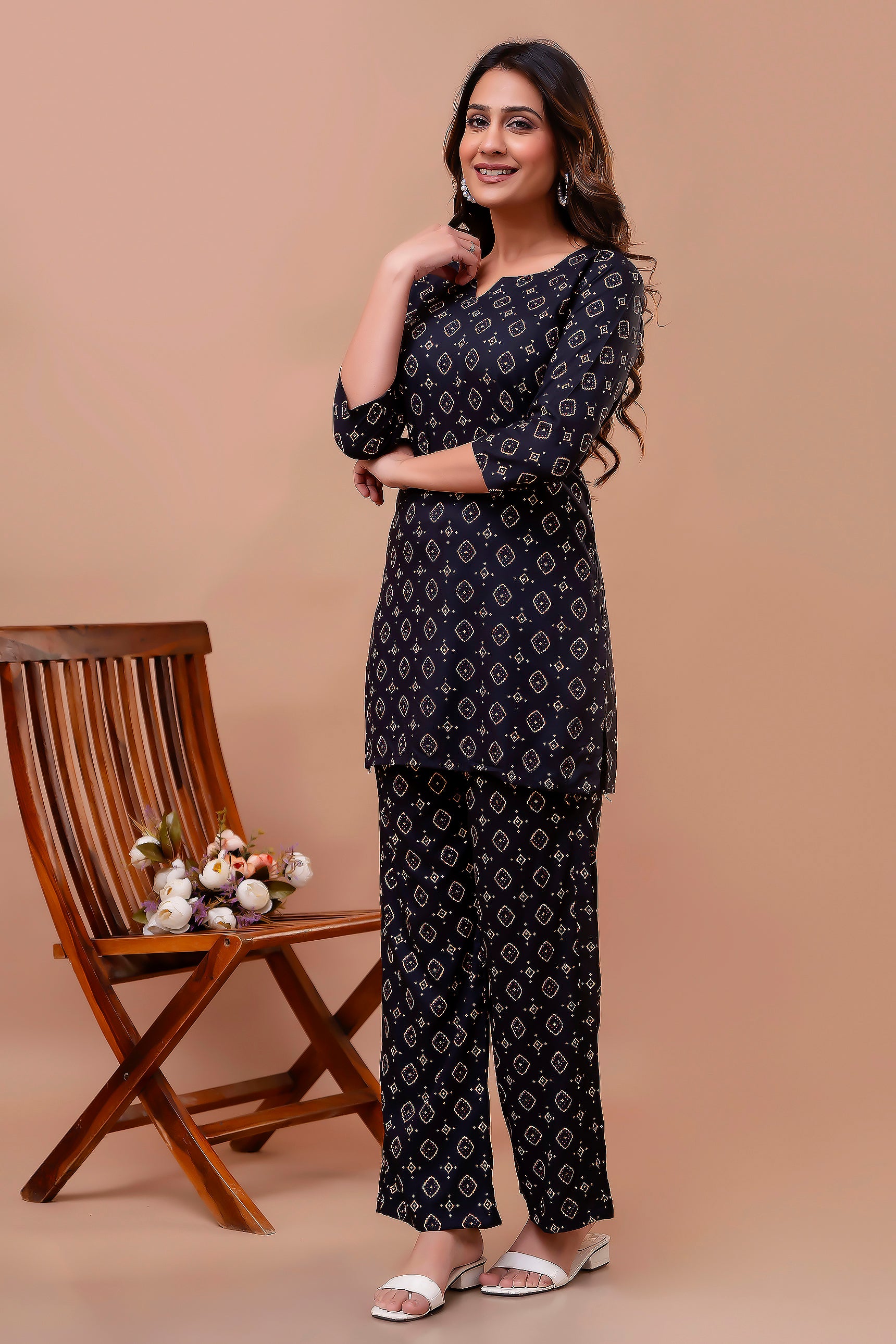 Black and white printed tunic, has a shirt collar neck and three-quarter sleeves, secured with button closure